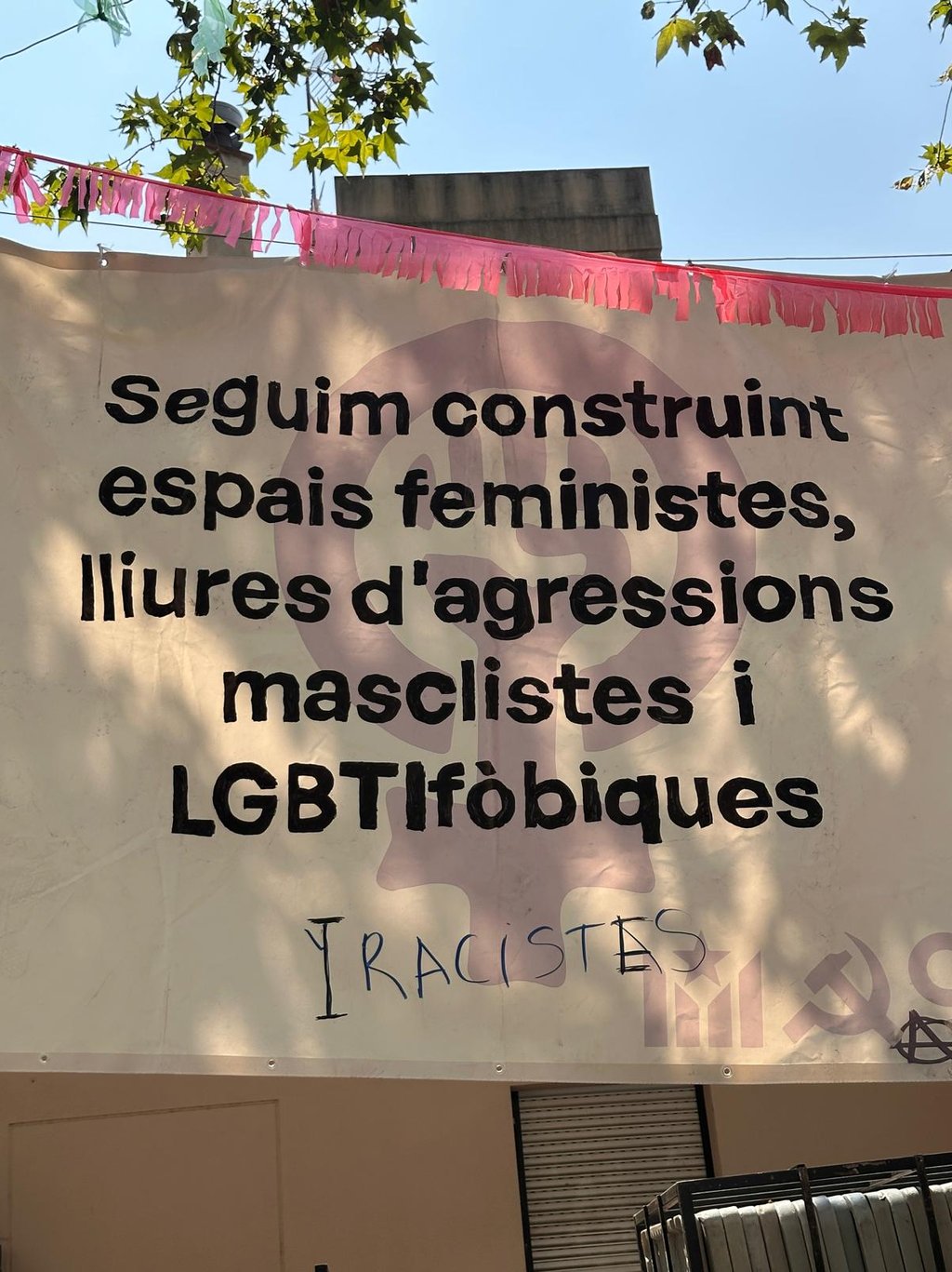 Mensajes “feministas y LGBTI ” con símbolos anarquistas y comunistas incluidos en la decoración oficial.