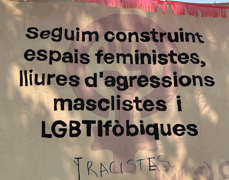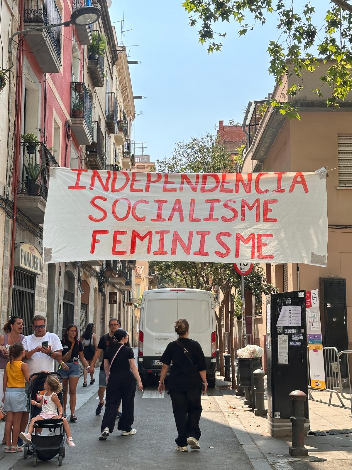 Bienvenida a las fiestas con iconografía comunista mezclada con la independentista. Lemas antifascistas y supuestamente feministas se exhiben con estética soviética, usados no contra el fascismo real, sino contra cualquier disidencia, como si fuera una asamblea ideológica y no una fiesta vecinal.