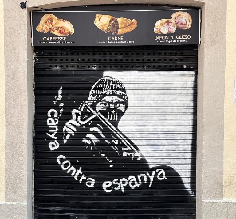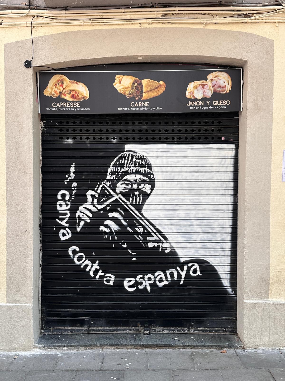 Pintada llamando a la “lucha contra España” y, por ende, contra cualquiera que piense distinto. Decoración permanente, ubicada curiosamente en la plaza Raspall, donde hemos encontrado toda esta propaganda