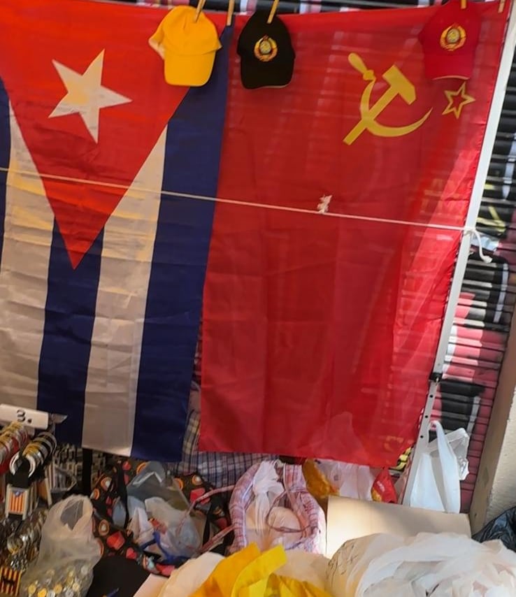 Bandera comunista (hoz y martillo), símbolo de regímenes represivos con millones de víctimas, exhibida junto a la cubana. ¿Solidaridad o cinismo? ¿Un guiño a la censura, el hambre y el exilio?